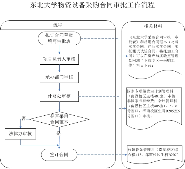 发布时间:2015-10-16 点击次数:197 发布人:null- 为进一步加强和规范我校物资设备采购合同管理,本着维护学校合法权益、保护学校利益和规避合同风险的宗旨,从即日起,物资设备采购小组将严格执行《东北大学合同管理办法(试行)》(东大校字[2014]44号)的规定。在加盖采购合同专用章前,承办部门经办人或项目负责人须填写《东北大学采购合同审核、审批表》,履行合同审批手续。凡涉及材料买卖、产品买卖、委托测试试验及委托加工等采购相关合同,原则上必须使用东北大学合同范本。相关材料可在资产与实验室管理处网站“下载专区”下载。