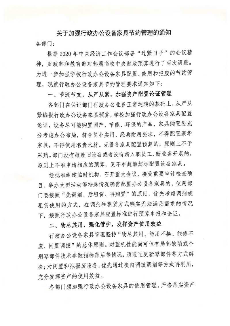 关于加强行政办公设备家具节约管理的通知