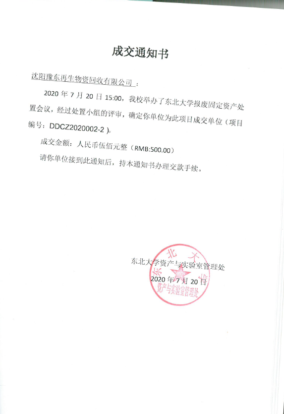 东北大学2020年第二批报废固定资产处置竞价成交结果公示(2020-7-20)