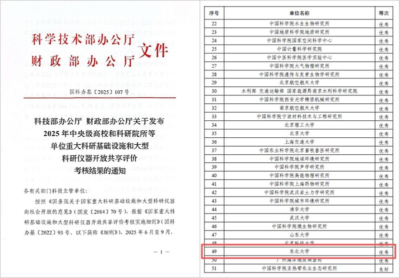 发布时间:2025-10-14 点击次数:111 发布人:10月10日,科技部、财政部印发《关于发布2025年中央级高校和科研院所等单位重大科研基础设施和大型科研仪器开放共享评价考核结果的通知》(国科办基(2025)107号),公布了全国26个部门344家单位的年度考核结果,东北大学在此次考核中荣获“优秀”,总排名第49名,高校排名第15名。