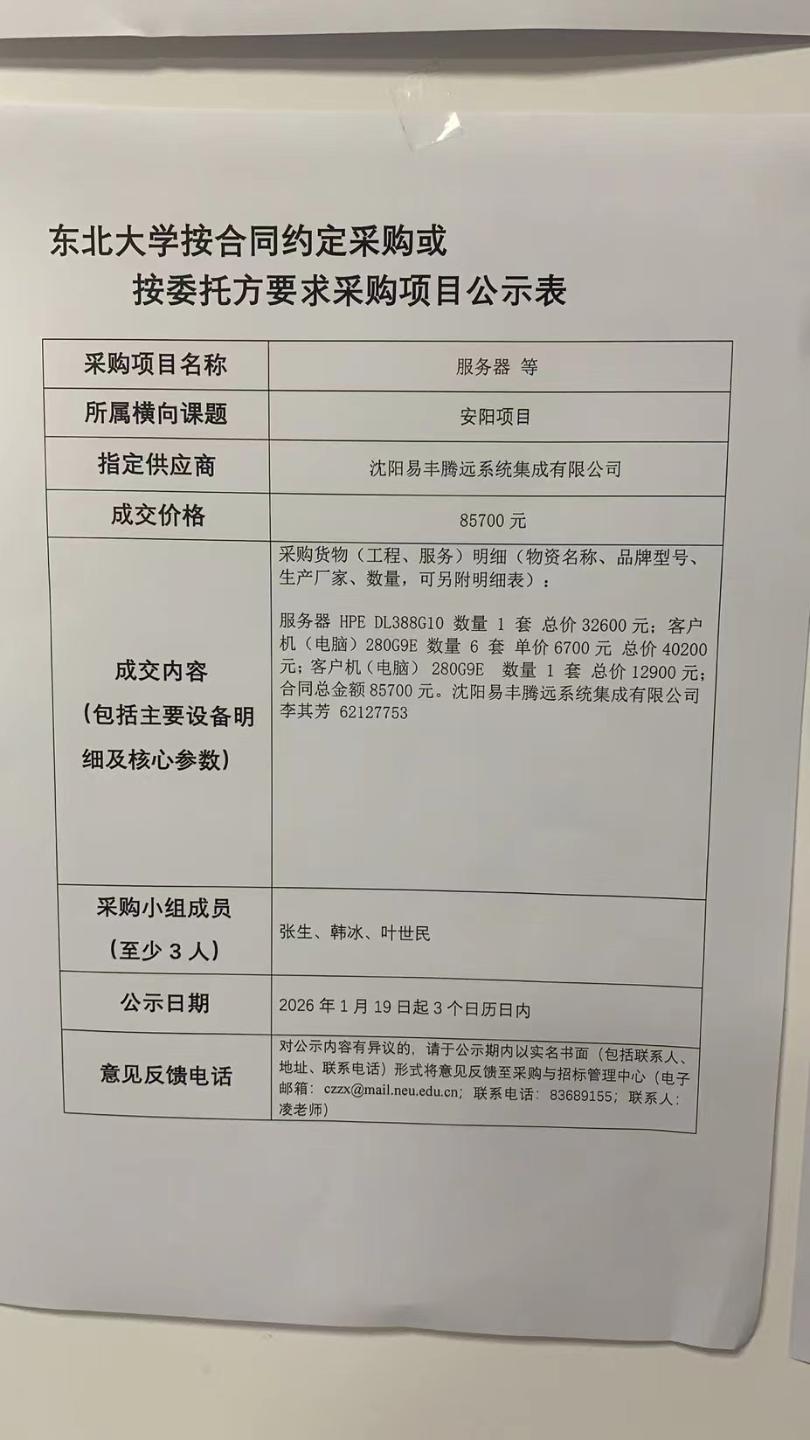 对公示内容有异议的潜在供应商,请于公示期内以书面形式(包括联系人、地址、联系电话)将意见实名反馈至东北大学采购与招标管理中心(联系电话:024-83689155;联系人:凌老师)