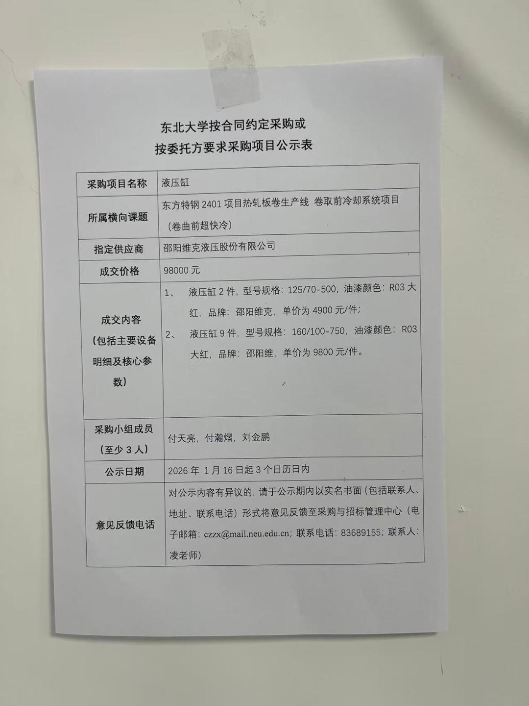 液压缸项目“按合同约定采购”公示