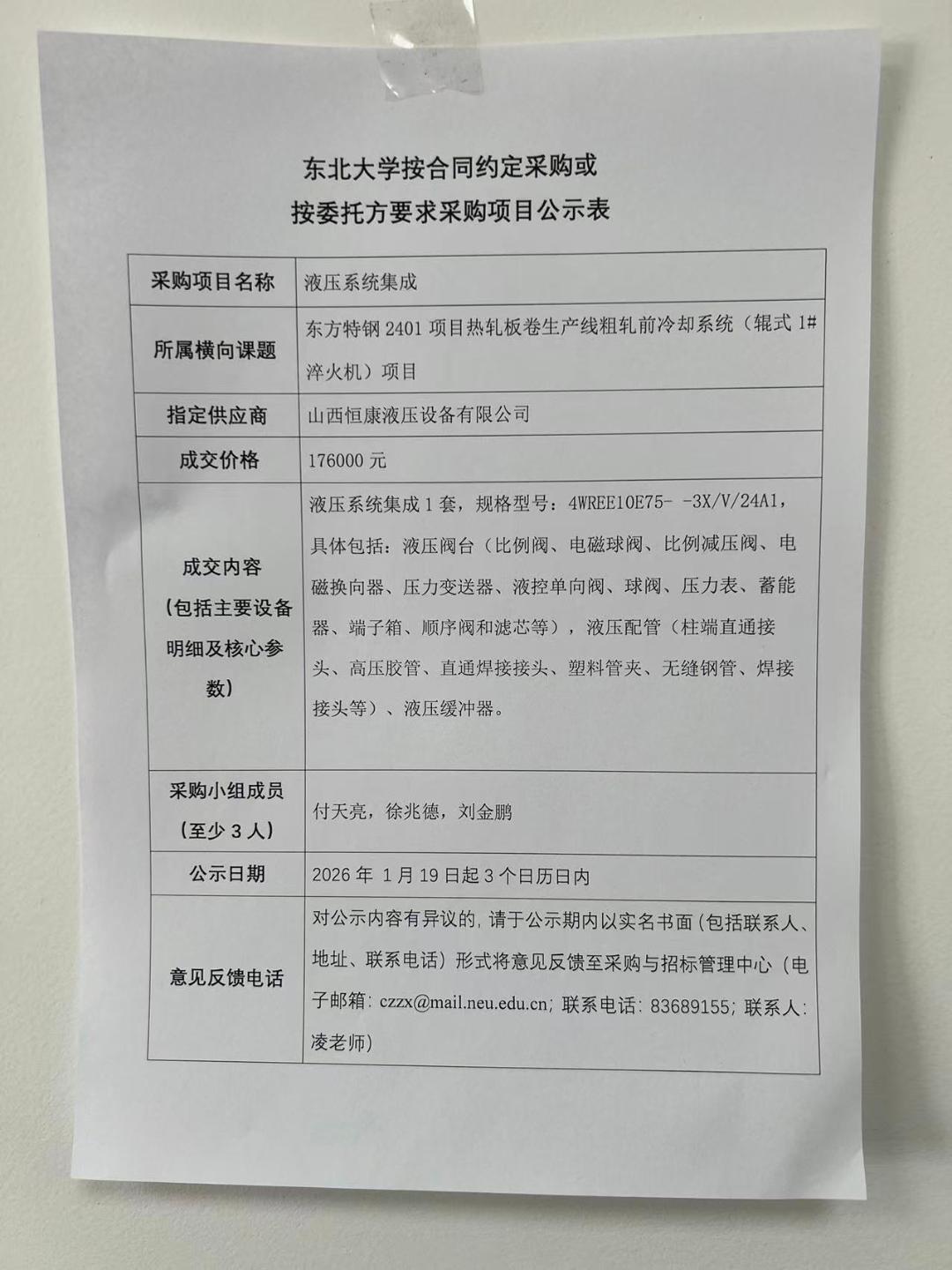 液压系统集成项目“按合同约定采购”公示
