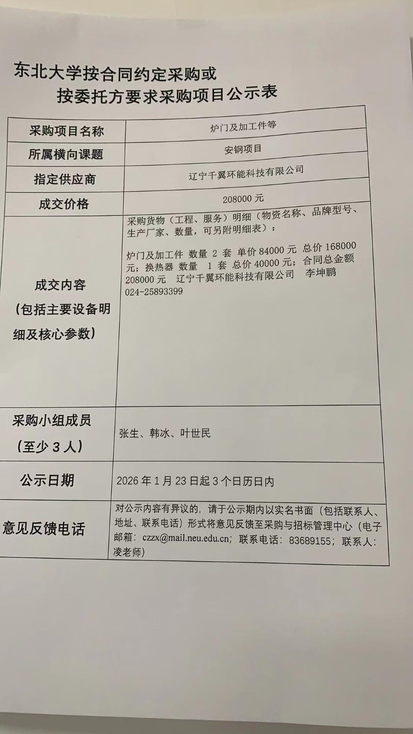 发布时间:2026-01-28 点击次数:11 发布人:采购项目名称:炉门及加工件、换热器