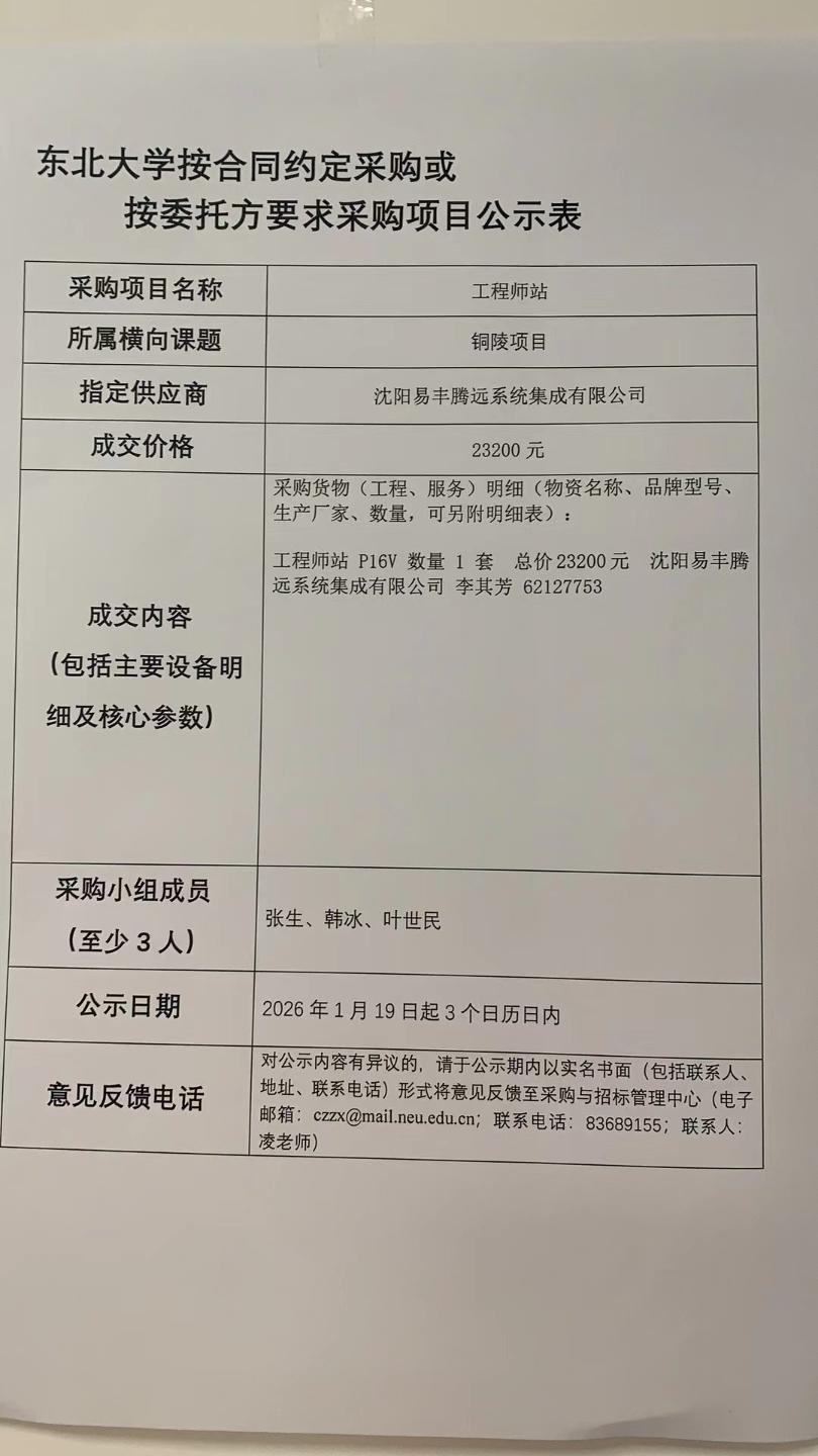 对公示内容有异议的潜在供应商,请于公示期内以书面形式(包括联系人、地址、联系电话)将意见实名反馈至东北大学采购与招标管理中心(联系电话:024-83689155;联系人:凌老师)