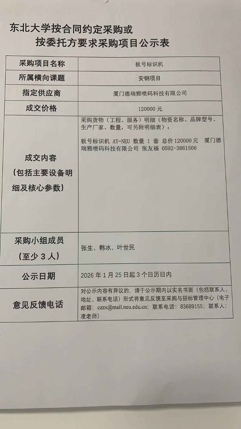 板号标识机“按合同约定采购”公示