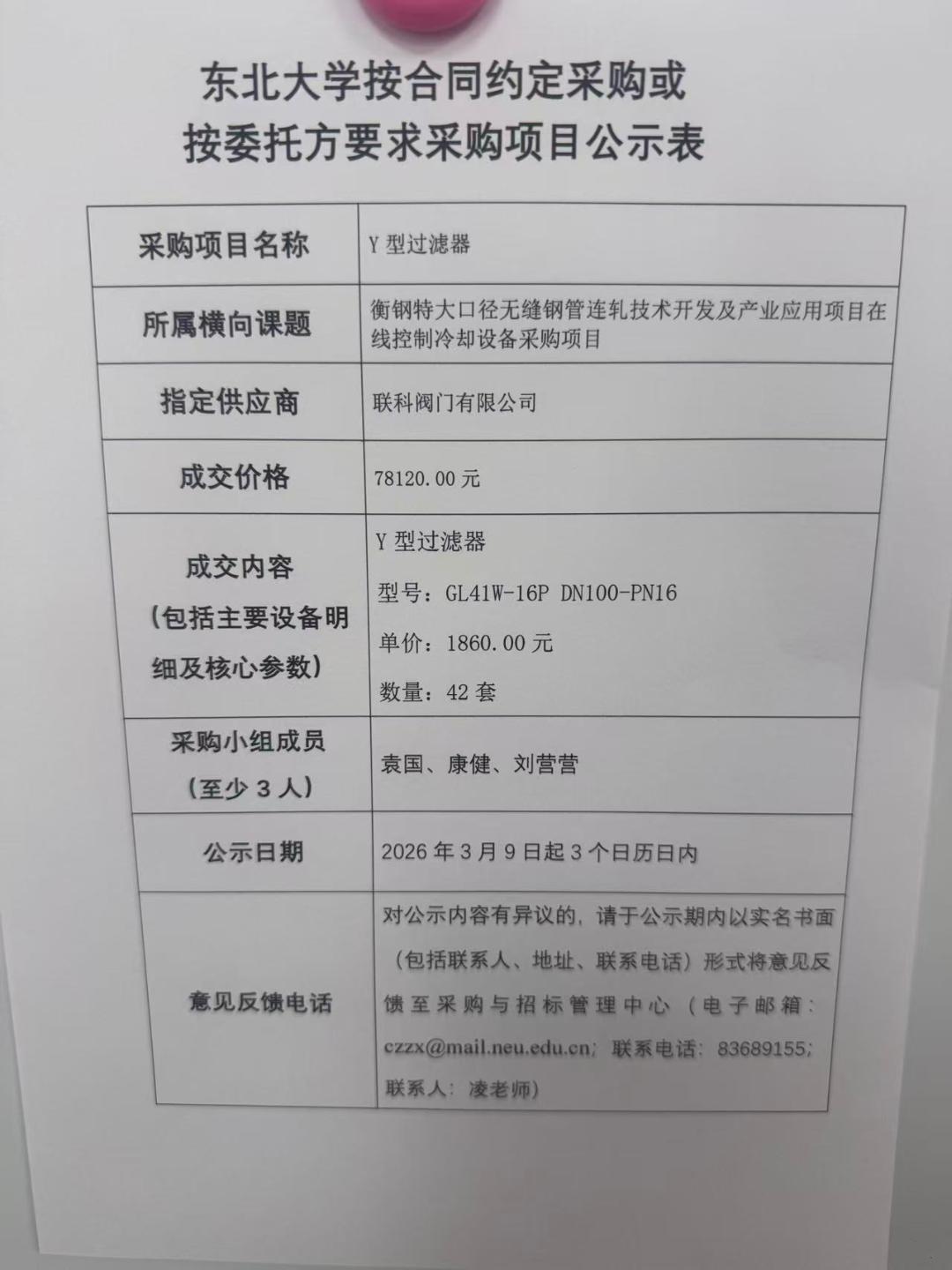 Y 型过滤器“按合同约定采购”公示