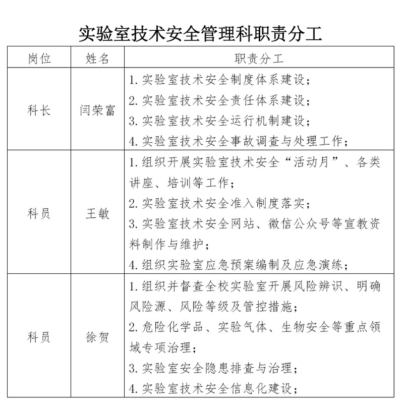 实验室技术安全管理科是负责学校教学、科研实验室技术安全管理的工作机构,其主要工作职责是: